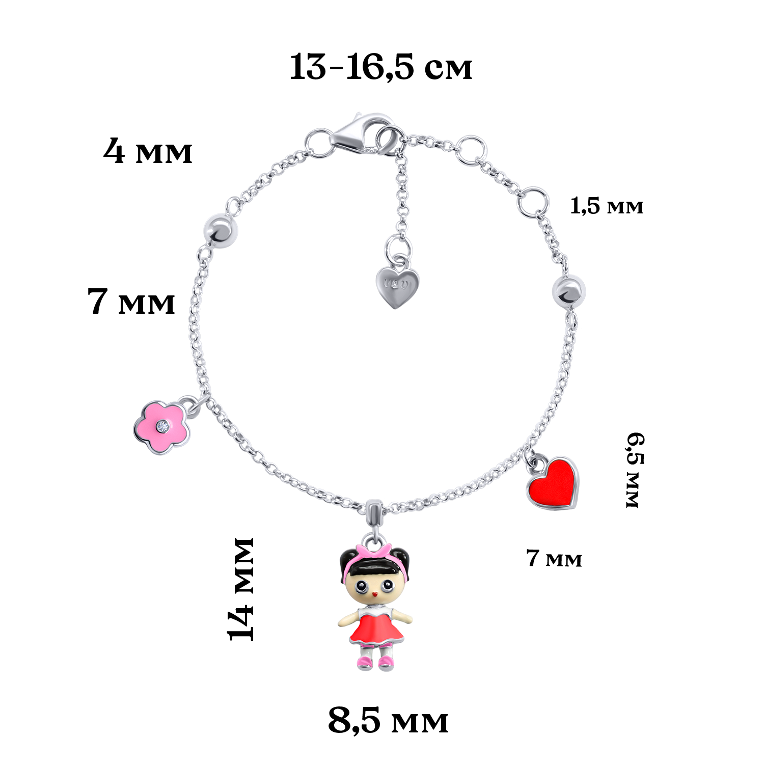 розмір 13-16,5, товщина – 1,5, бусінки Ø4, квітка Ø7, серце: висота – 6,5, ширина – 7, Лола: висота – 14, ширина – 8,5