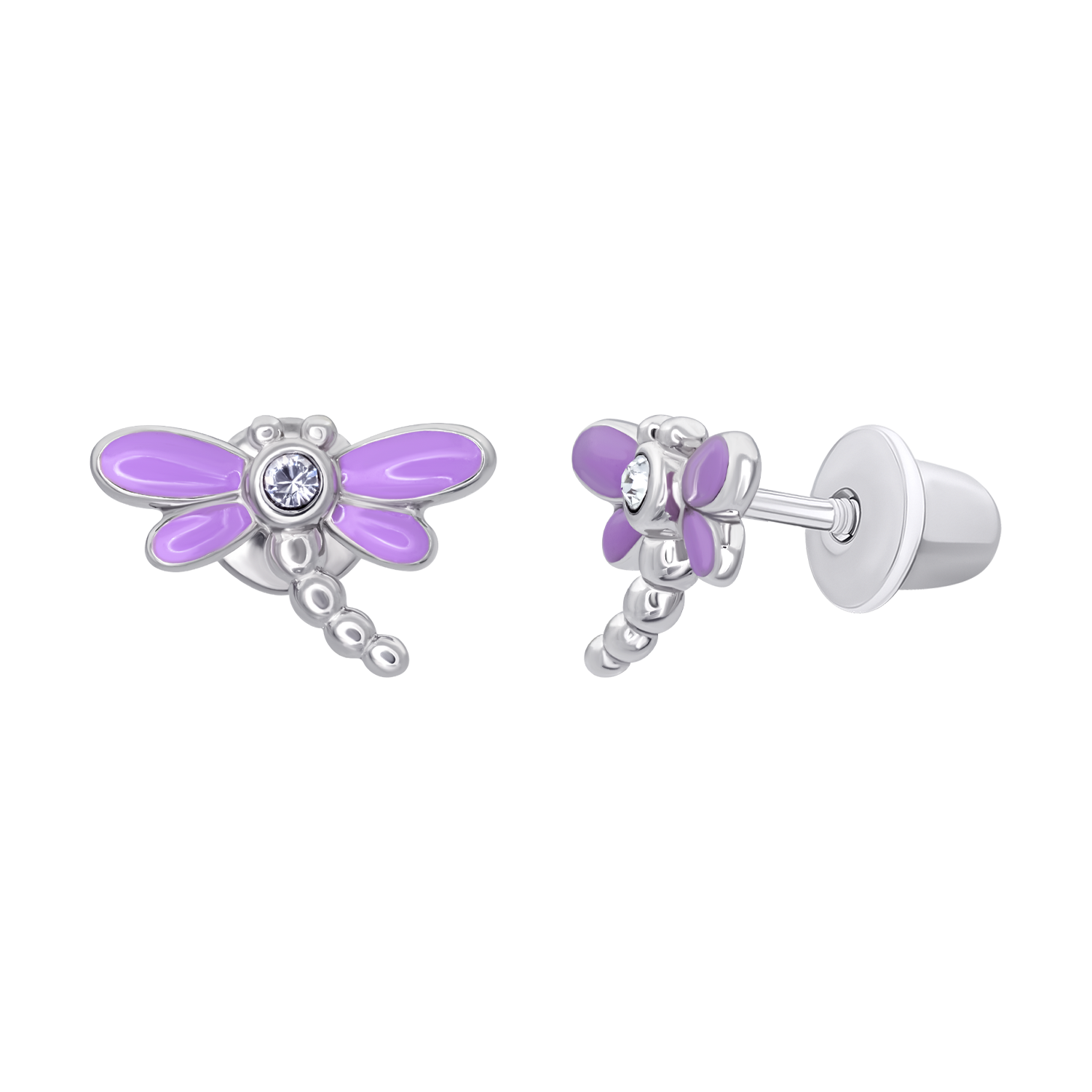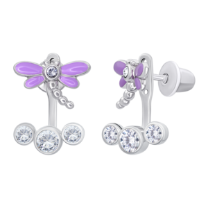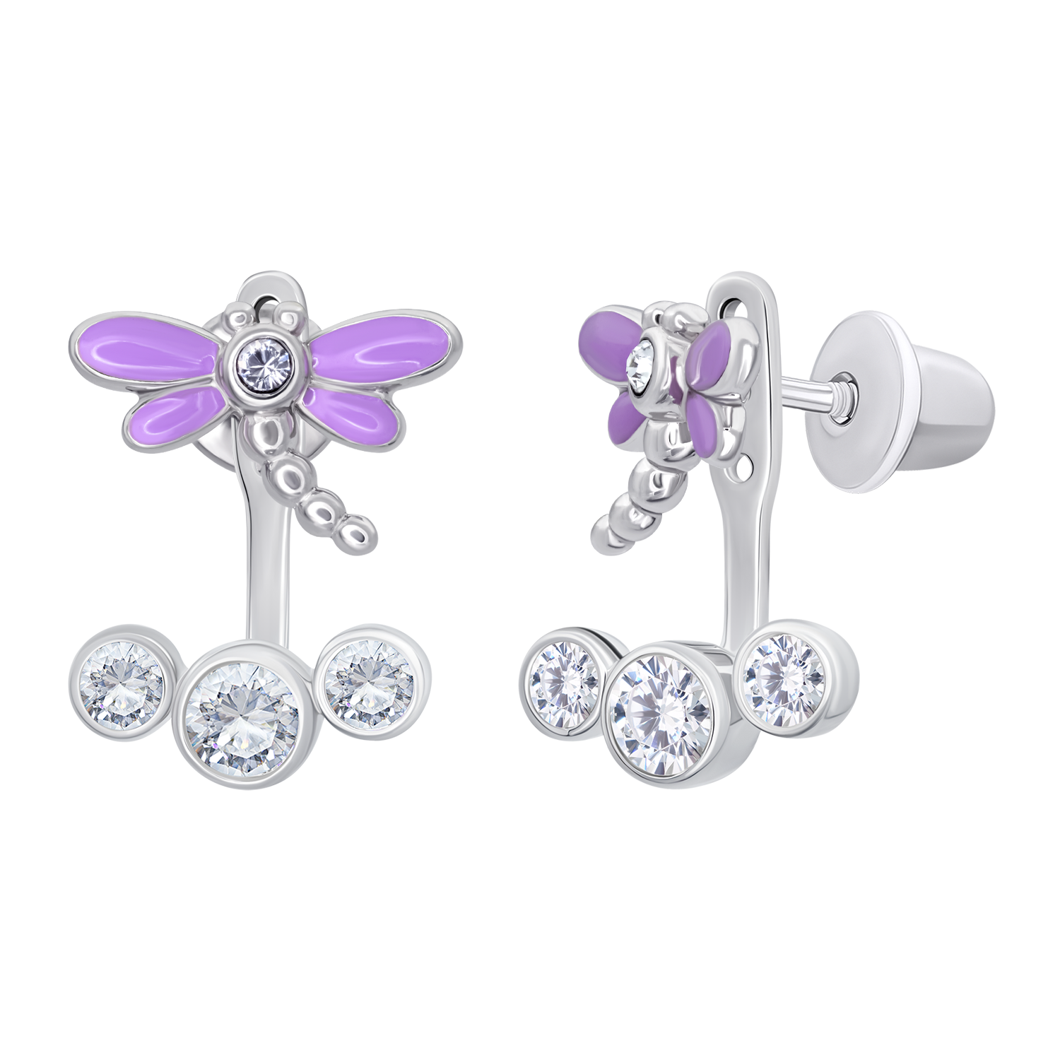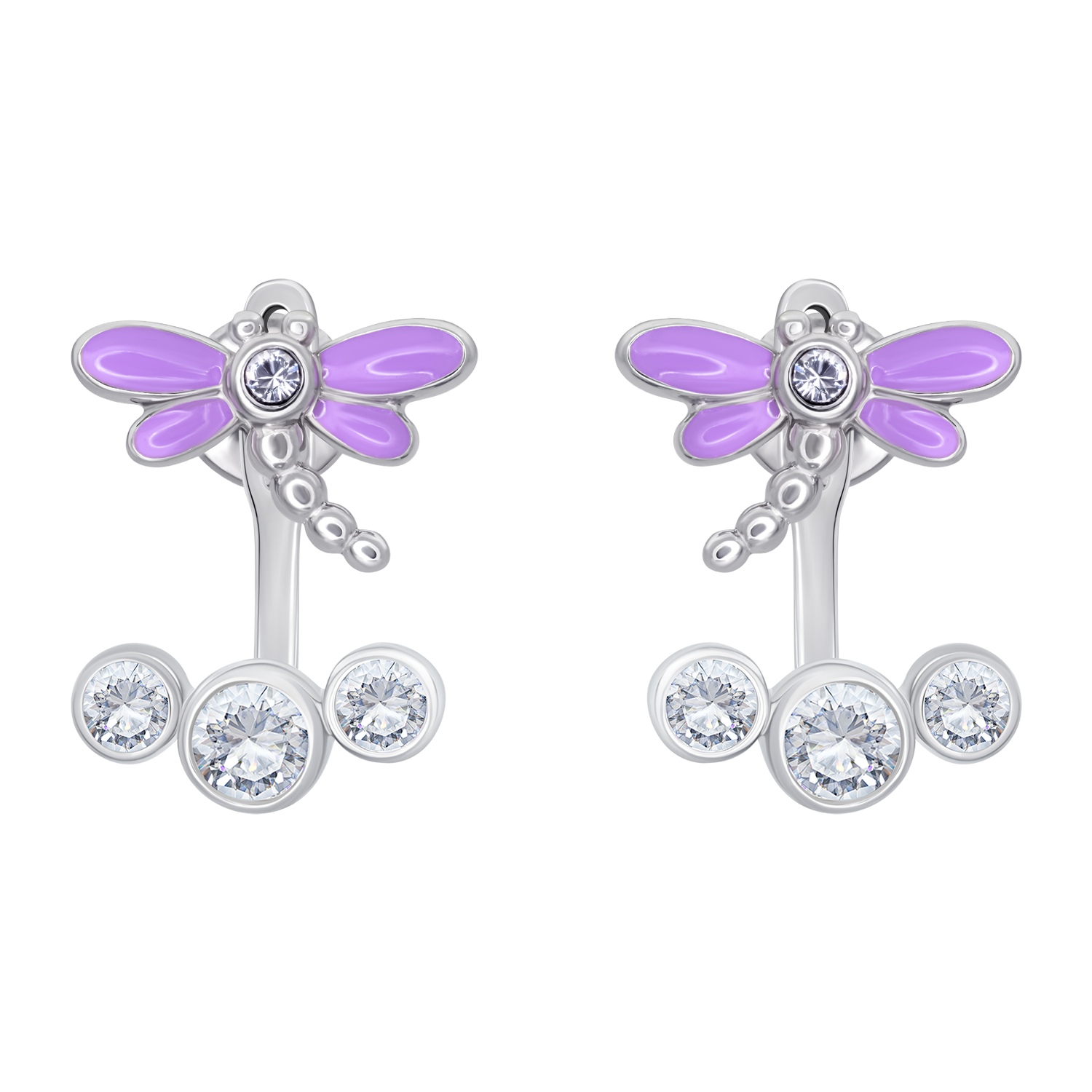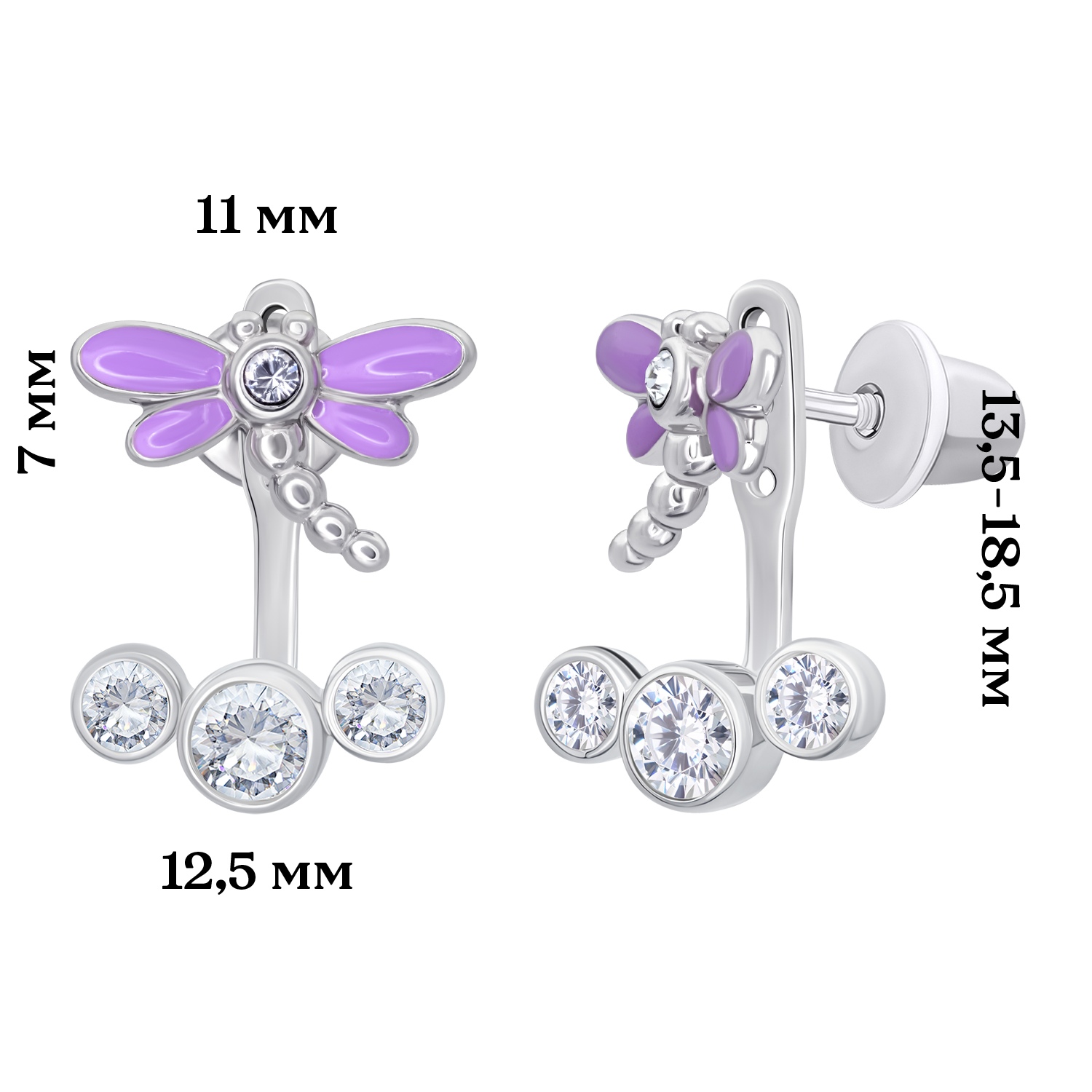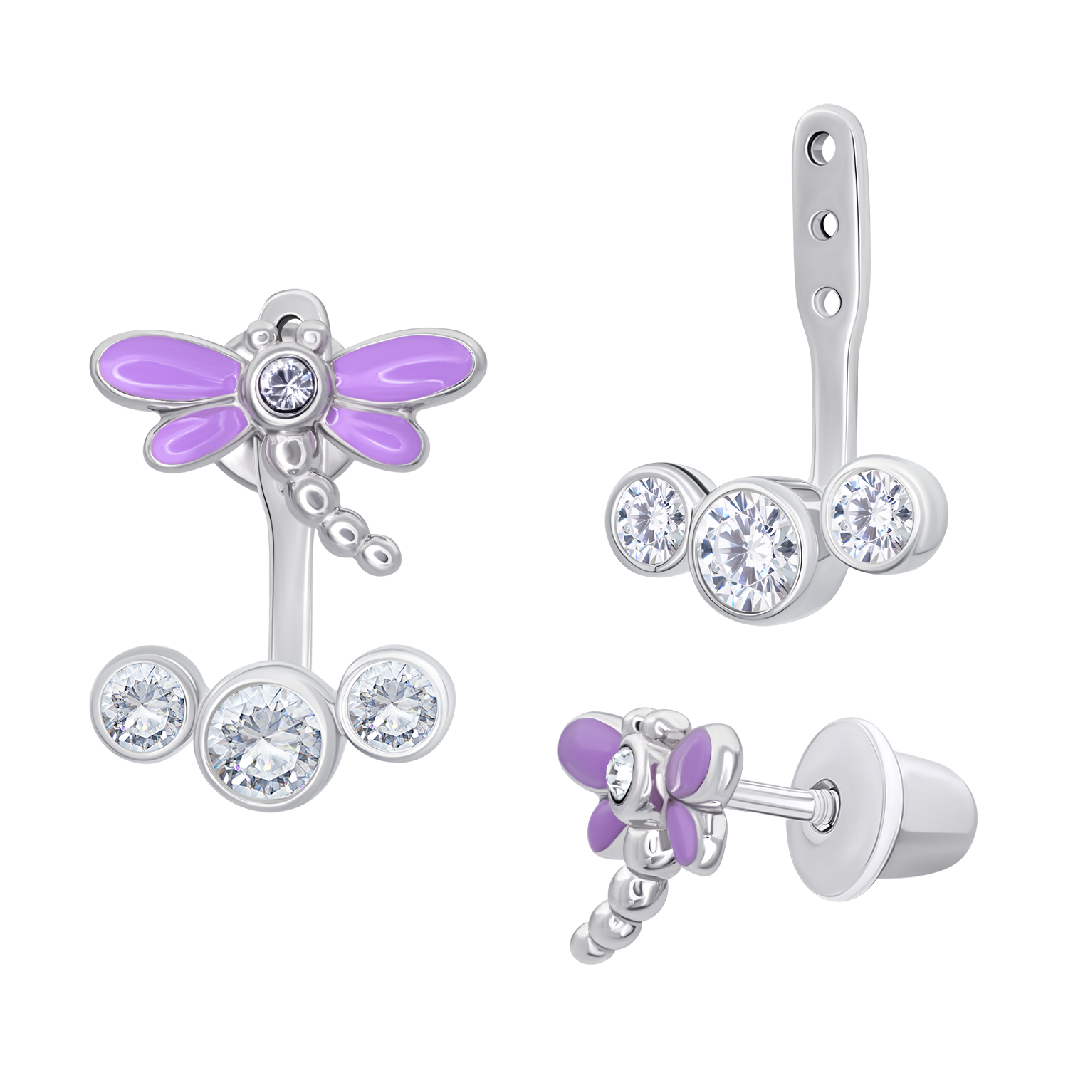 Сережки-джекети Бабка з фіолетовою емаллю та фіанітами із колекції UmaUmi Fly – красиві, легкі і зручні дитячі сережки. Відмінний ювелірний подарунок на будь-яке свято!