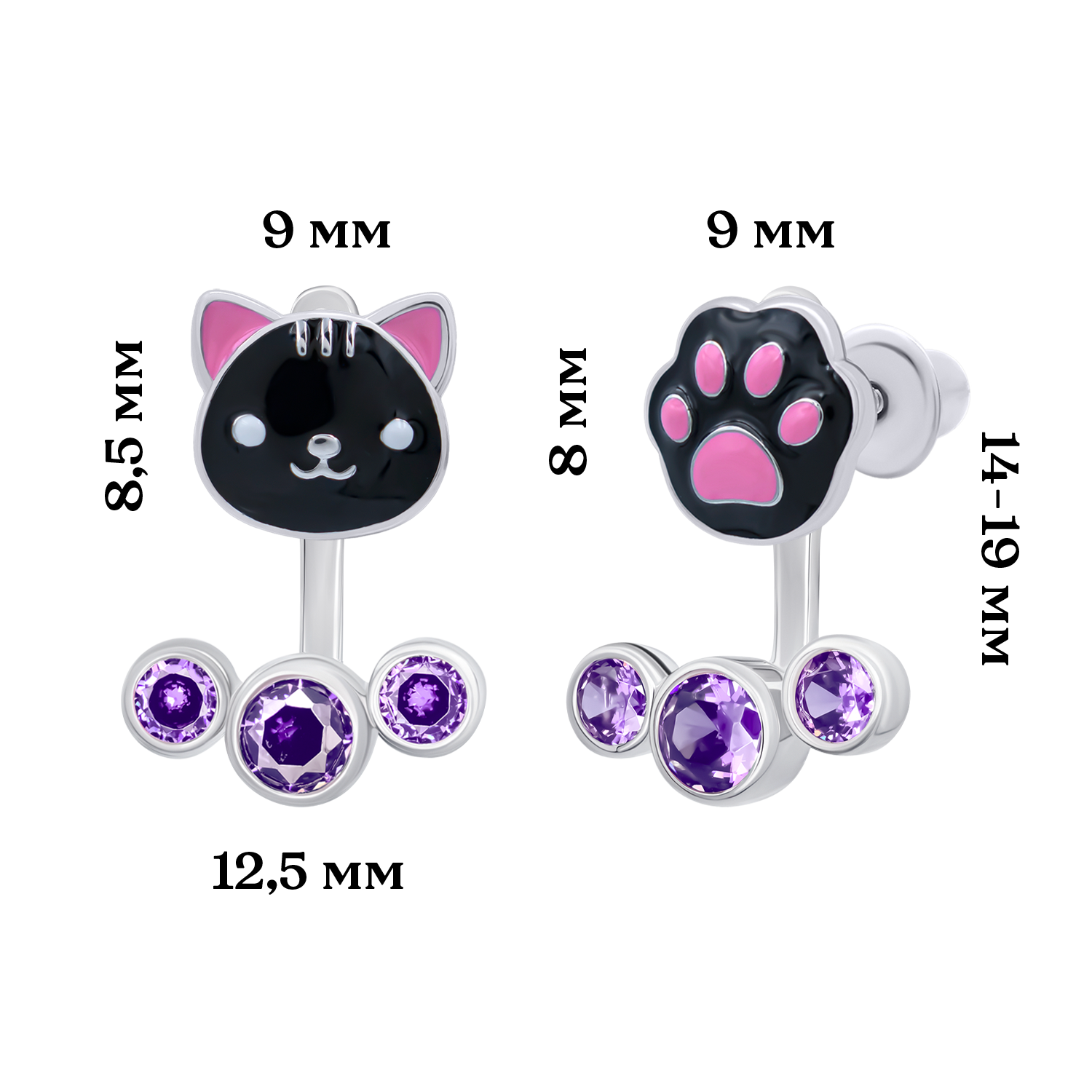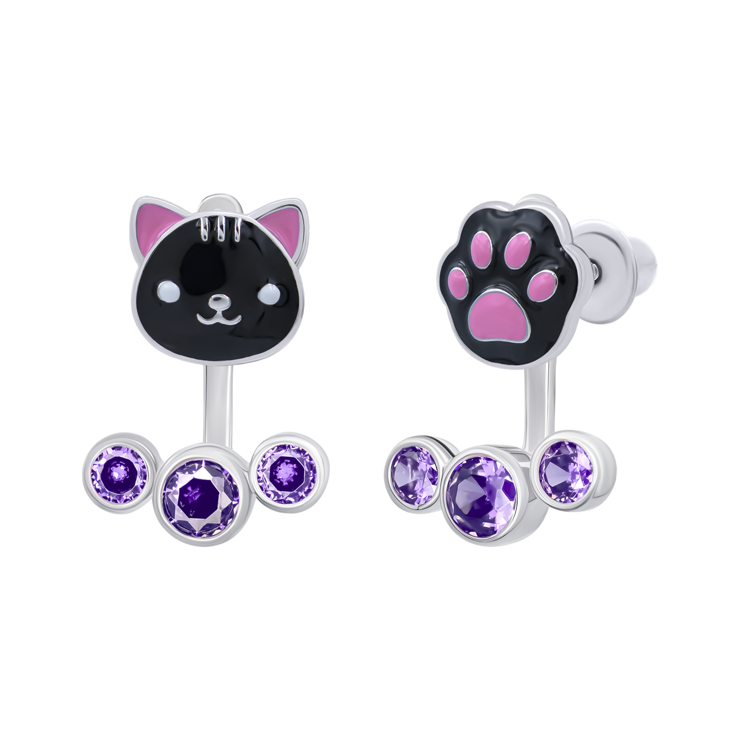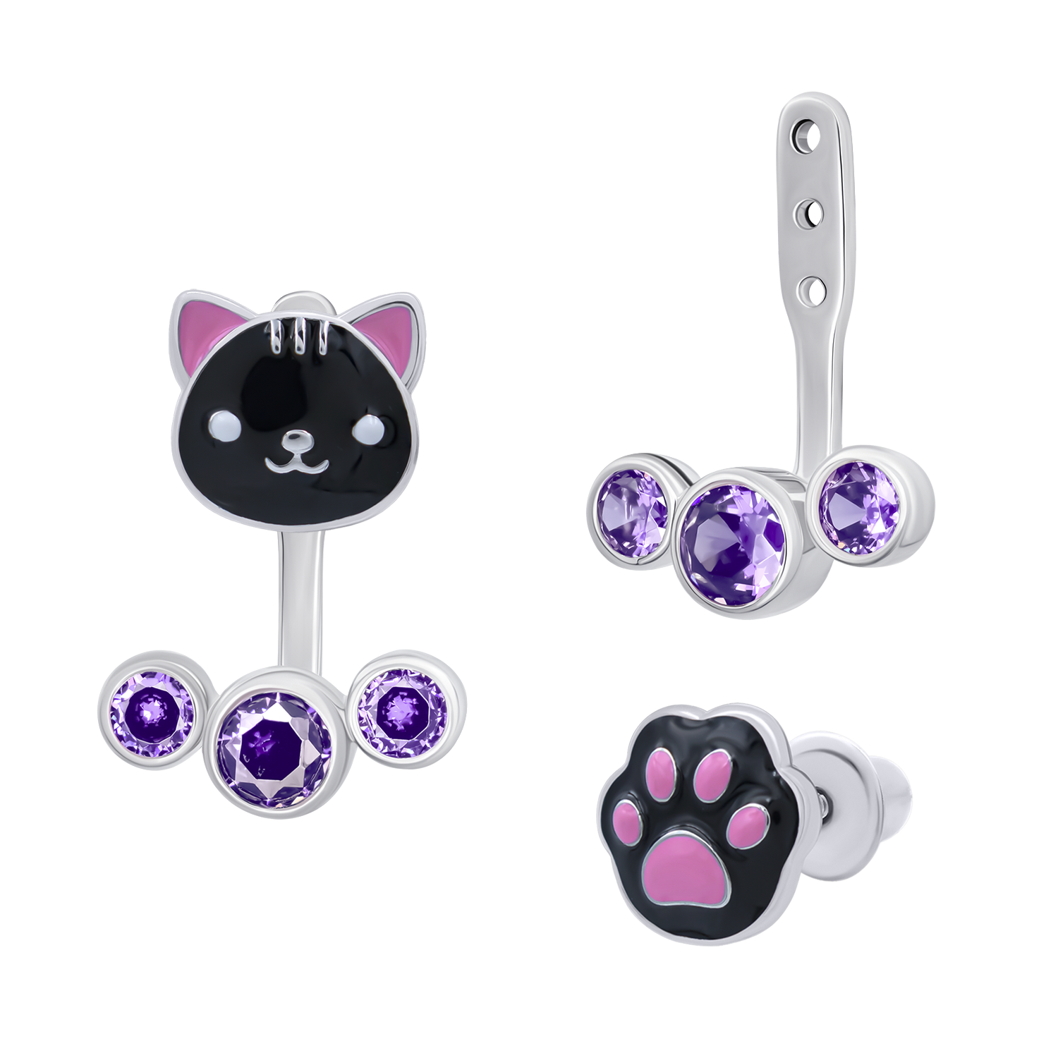 Сережки-джекети Котик з лапкою із чорною емаллю та фіанітами