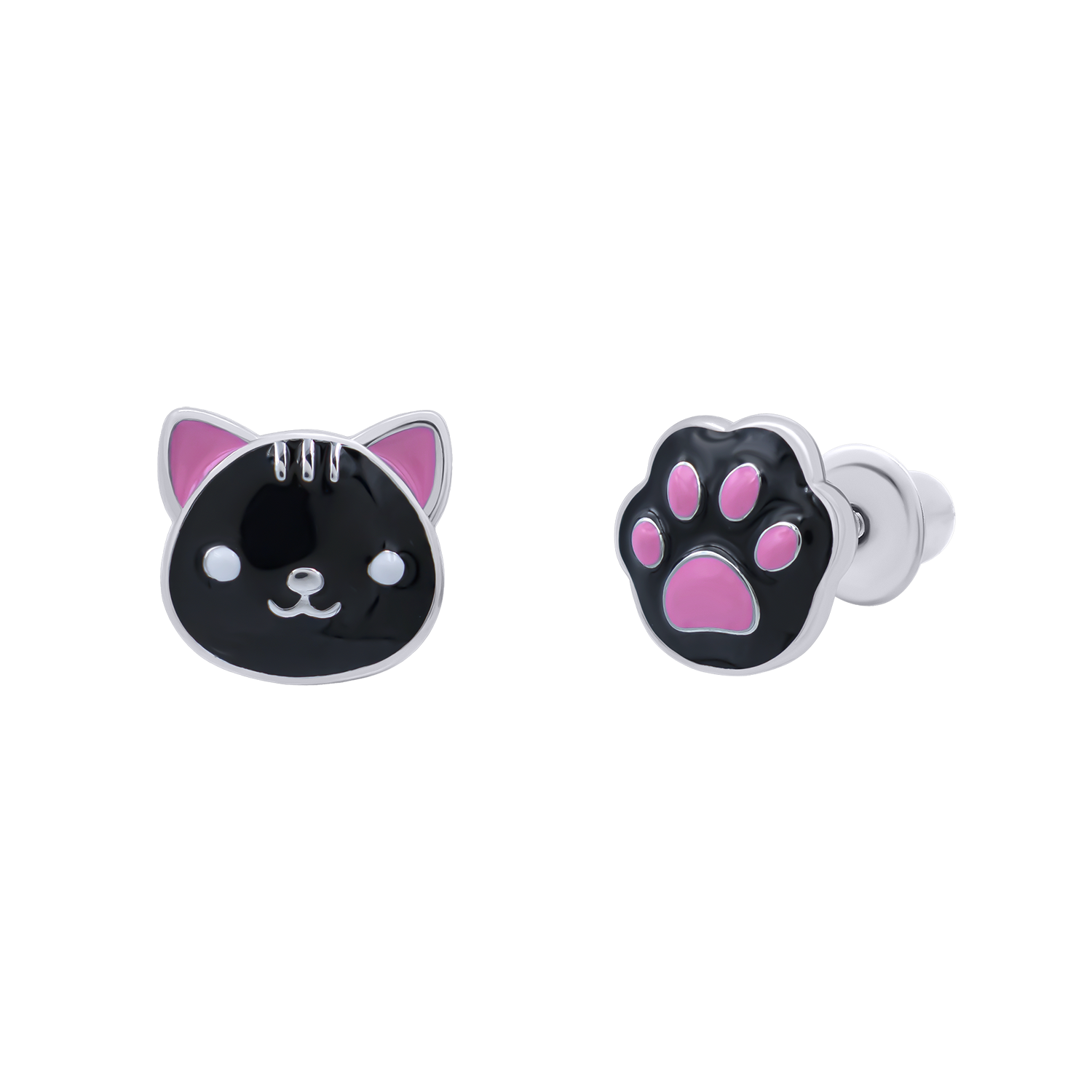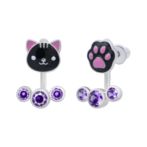 Сережки-джекети Котик з лапкою із чорною емаллю та фіанітами із колекції UmaUmi Pets – красиві, легкі і зручні дитячі сережки. Відмінний ювелірний подарунок на будь-яке свято!