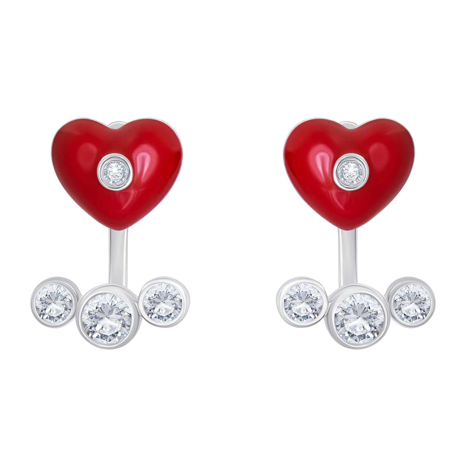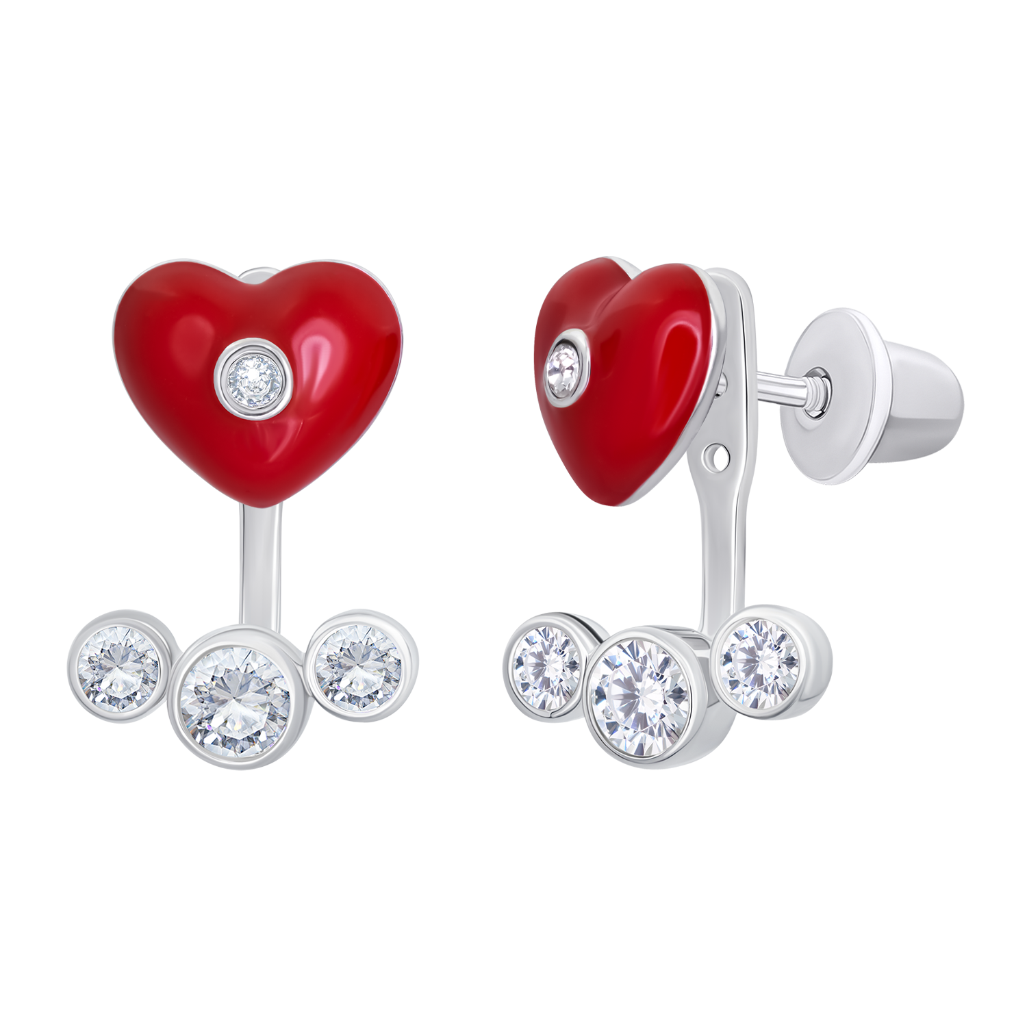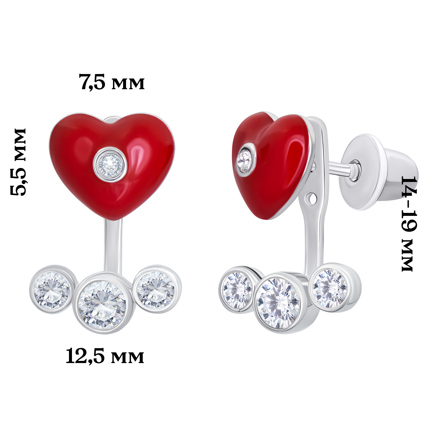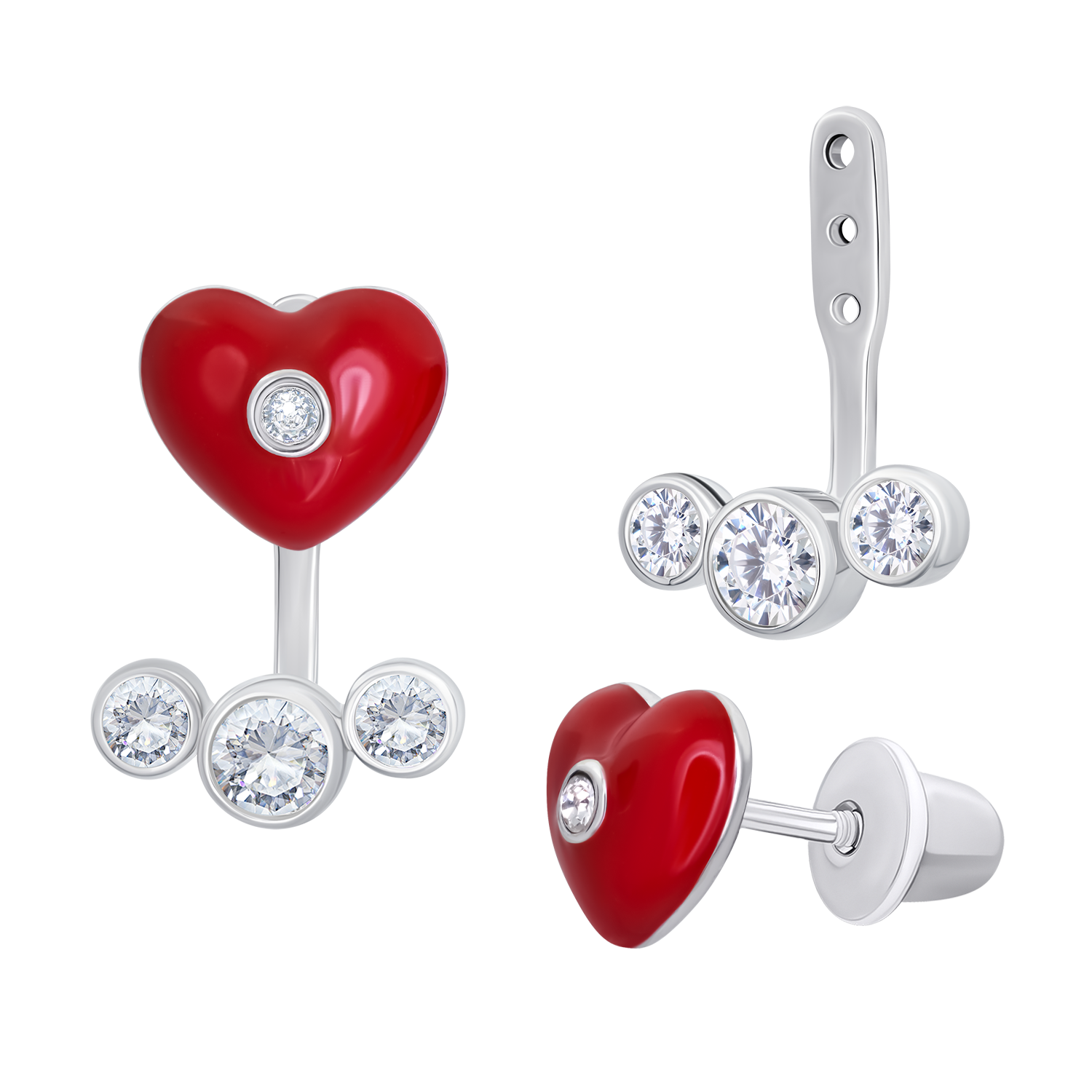 Сережки-джекети Серденько з червоною емаллю та фіанітами