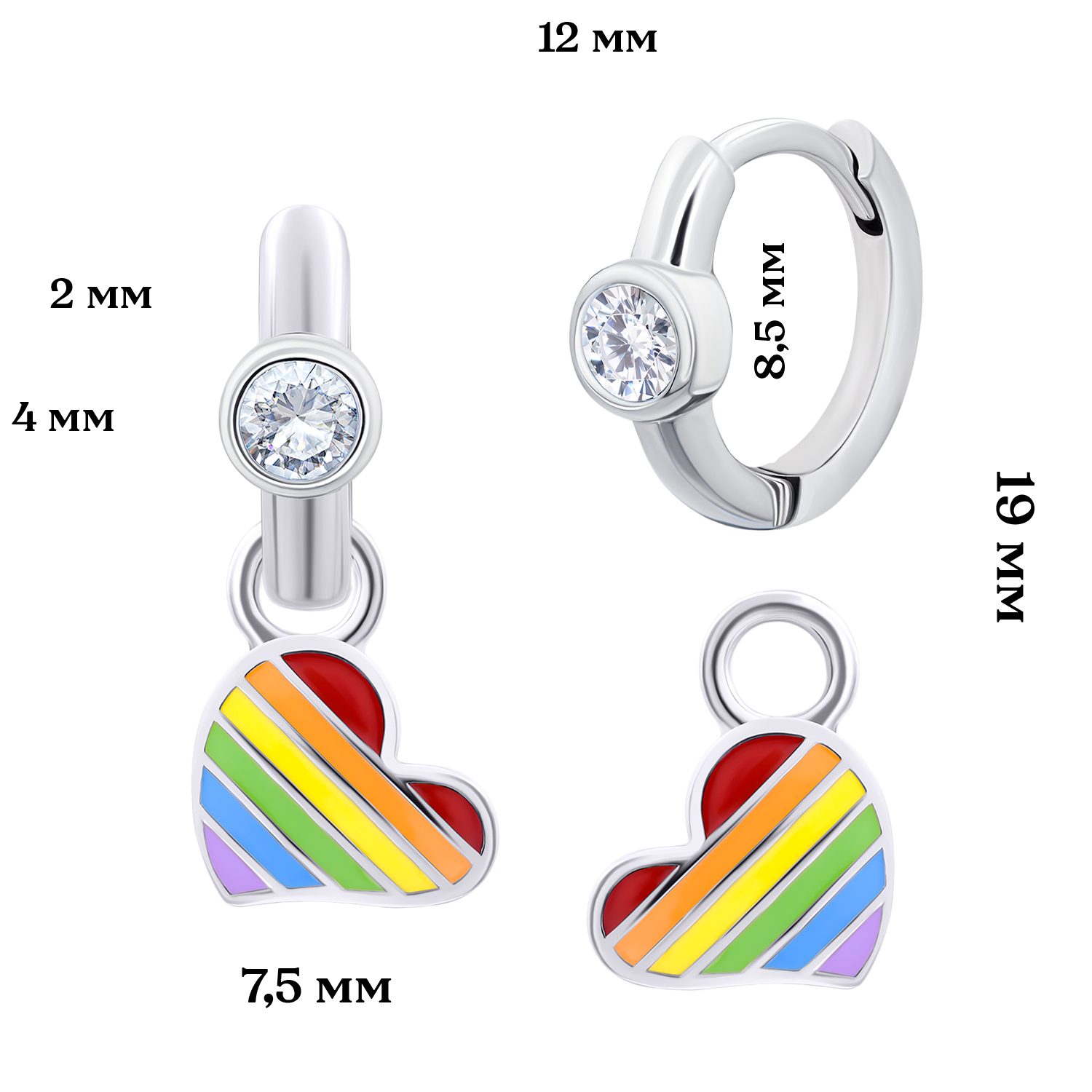 висота – 19, ширина – 7,5, внутрішній Ø8,5, зовнішній Ø12, ширина – 2, фіаніт Ø4