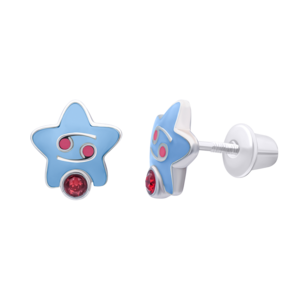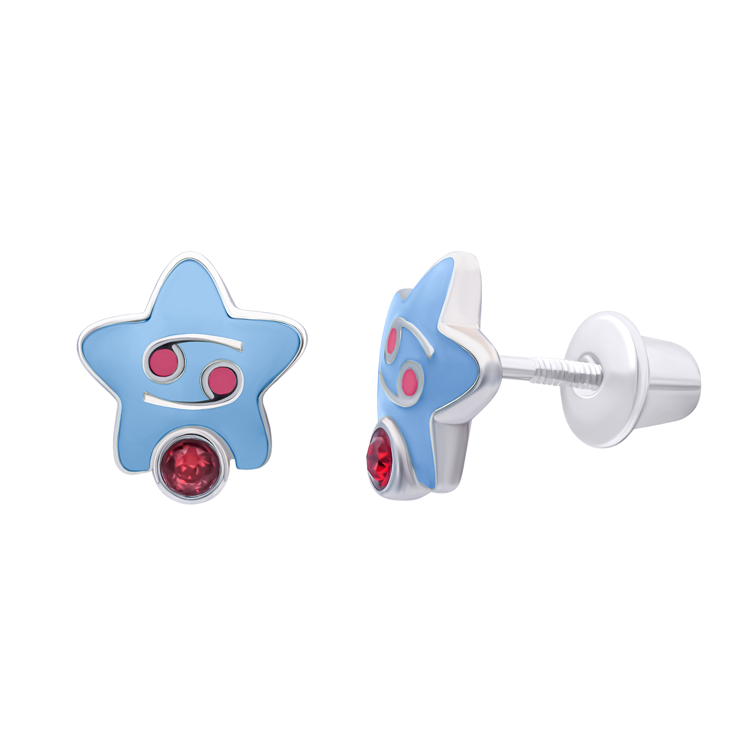 Сережки-зірочки Рак з талісманом з червоними фіанітами із колекції UmaUmi Zodiac – красиві, легкі і зручні дитячі сережки. Відмінний ювелірний подарунок на будь-яке свято!